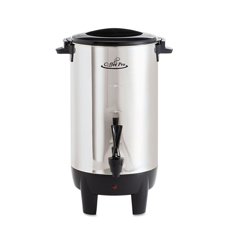 Features locking safety lid, carry handles and dripless safety spigot. With high dome design, volume sight glass and lighted power switch. Standard two prong plug. Includes water dispenser. Built-in coffee filter. No need for disposable filters.