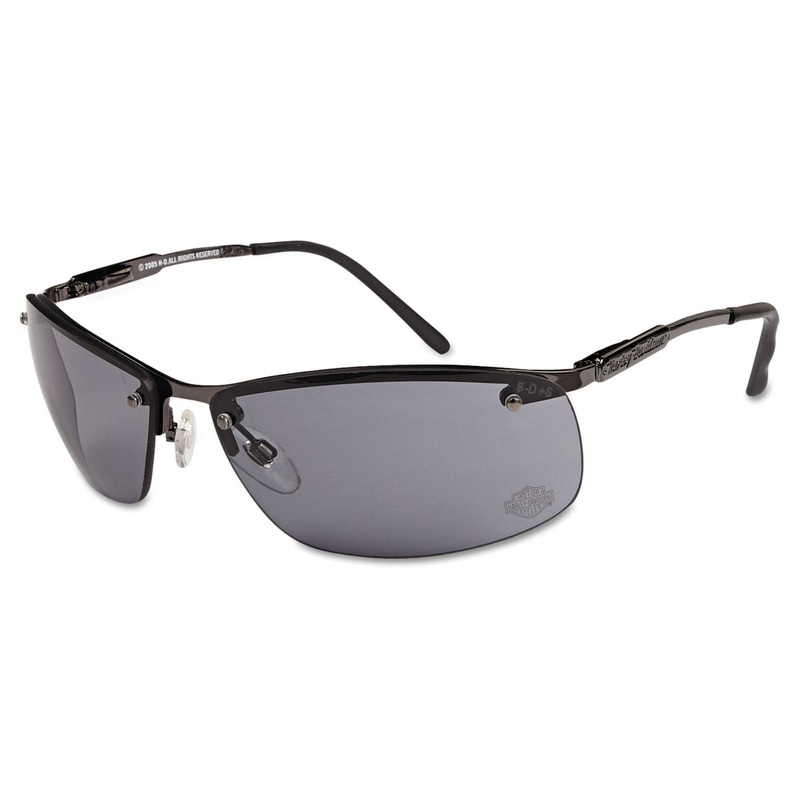 Breakthrough styling features premium, gunmetal finish, 8-base frame and spring-hinged temples for maximum comfort. Sunglass style safety frame has Harley-Davidson signature logo cold-forged into each temple. Classic Bar and Shield logo is "laser-engraved"