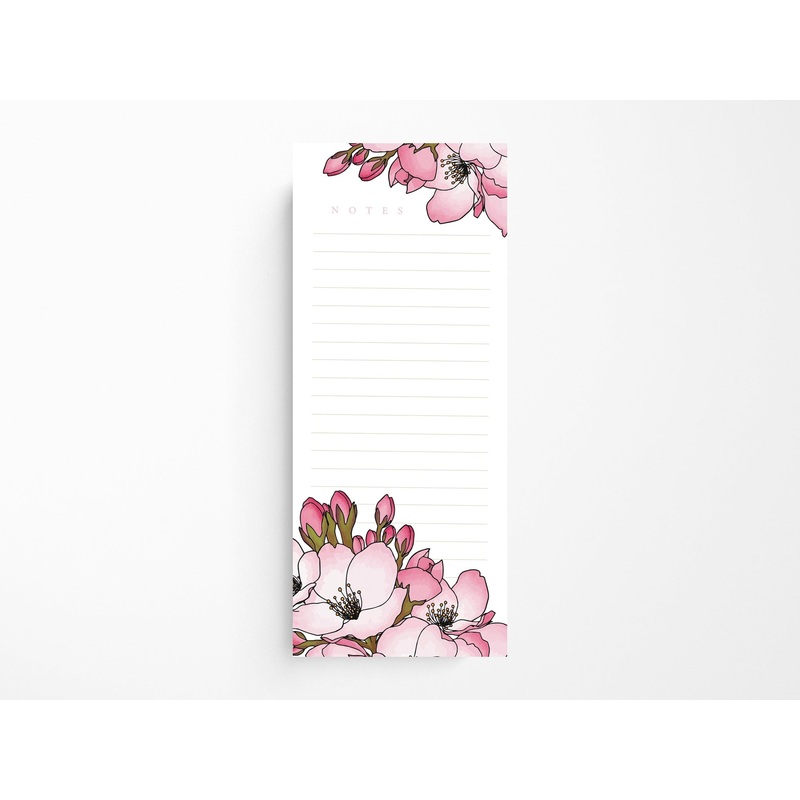 This vertical notepad will keep the spirit of cherry blossoms on your desk year-round. With 50 pages of smooth white paper featuring an illustration of pink cherry blossom flowers, lined, with a header that reads 'NOTES.'Pad measures 3.5" X 8.5"50 tear-off