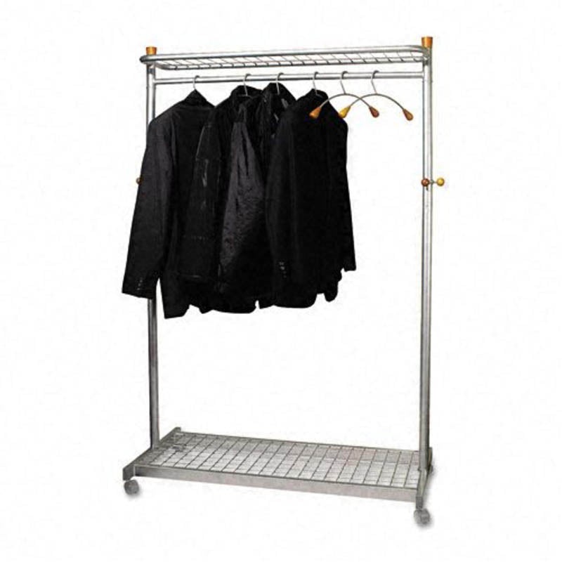 FeaturesSix hangersStylish combination of steel tubing and wood detail.Features six accessory hooks and four casters, two locking.DetailsStylish combination of steel tubing and wood detail. Features six accessory hooks and four casters, two locking. Holds