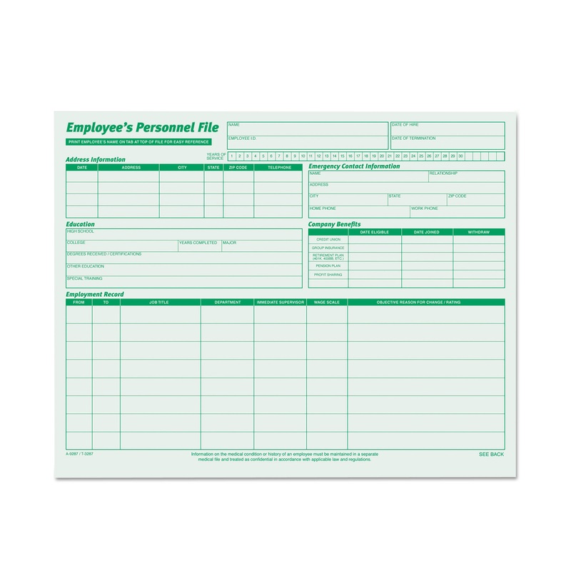 File folders include all you need to build a complete employee record in a legal manner. Update employee history and status on front, confidential material on back. Post Hiring Inquiry guides when insurance, Social Security, benefit plans, bonding, etc. ma
