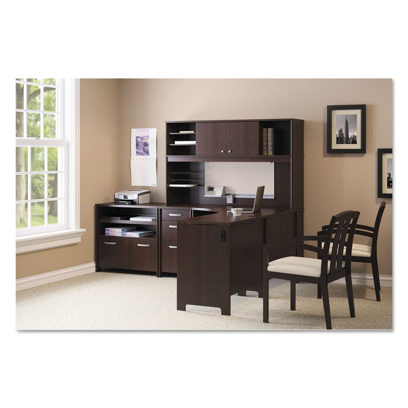 Durable thermally-fused laminate top surface for long wear. Finished approach side allows placement in the middle of a room. Drawers operate smoothly on ball bearing slides. Full-extension file drawer accommodates letter/legal size files while 3/4-extension pencil and box drawers hold miscellaneous supplies. Stylish profiled edge detail on uprights plus protective grooved edge banding to shield against bumps and scratches. Handy wire management grommets with cable covers.