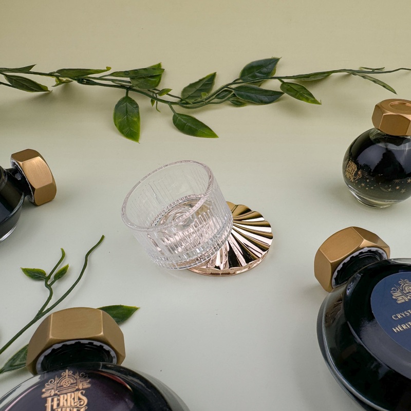 Our goal in designing the Carousel Inkwell was simple: to create a beautifully functional tool that elevates the experience and enjoyment of fountain pen inks. The Sunset Gold Inkwell is not only a functional tool, but the most joyous expression of our design philosophy embodying the spirit of Ferris Wheel Press.