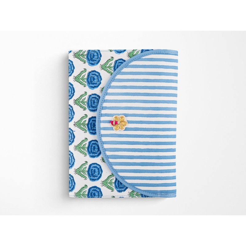 This Indian cloth was created using block prints, with a beautiful blue. The center of the flap contains a pink charm from India. This tri-fold cover stays shut with a button and has an interior pen hook to store a pen by its clip.