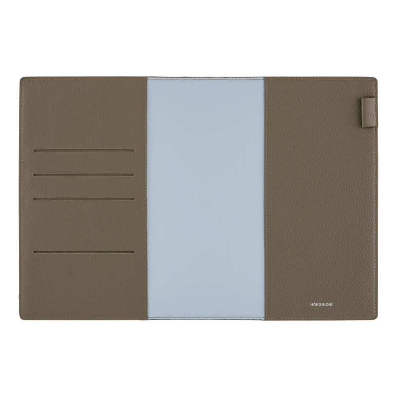 A stylish leather cover that fits snugly around your techo. Designed so that your techo will become even more compact and easy to hold. The front cover is in a warm gray, while the back cover is a cool-toned light blue. Having used a specialized manufacturing process, you can enjoy two colors on this one sheet of leather. It has a simple shape and includes a hook that can store a pen by its clip.