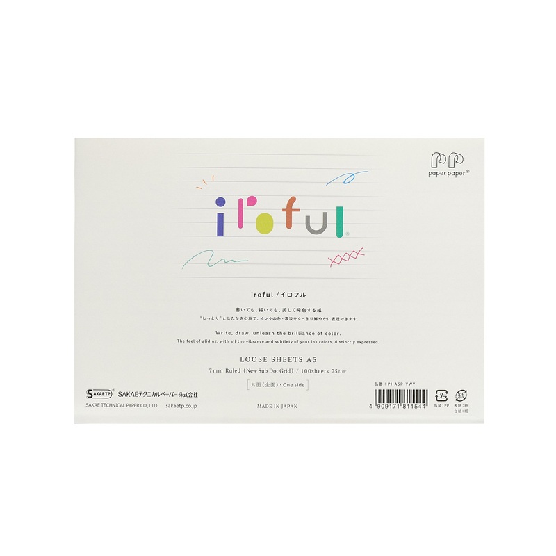 Imported from Japan, Iroful paper is coated on both sides to offer a smooth texture with a 75gsm weight. It is incredibly fountain pen friendly and highly resistant to bleed through and feathering.This product includes 100 loose sheets of 7mm lined off-whi