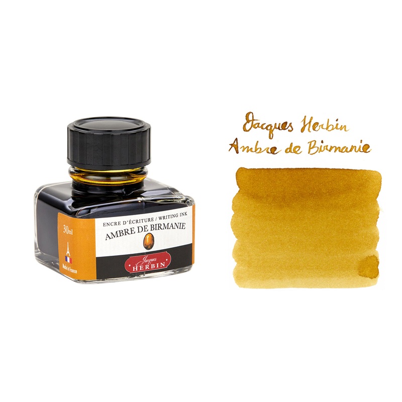 This 30ml glass bottle of Jacques Herbin Ambre de Birmanie yellow fountain pen ink is elegantly labeled and has an integrated pen rest. Jacques Herbin ink is non-toxic and pH neutral, water based, flows smoothly, and uses all natural dyes.Ambre de Birmanie