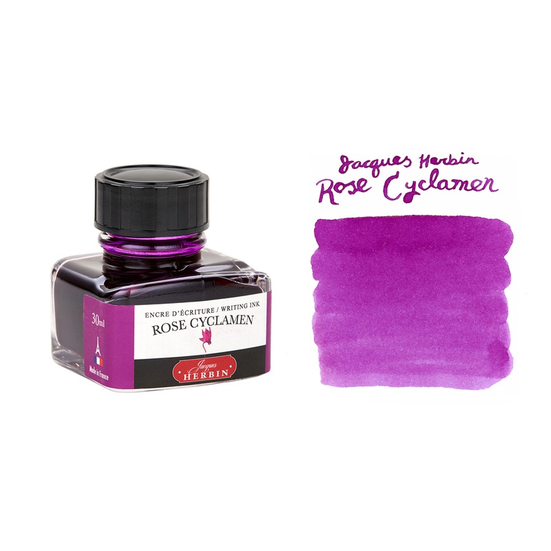 This 30ml glass bottle of Jacques Herbin Rose Cyclamen fuchsia fountain pen ink is elegantly labeled and has an integrated pen rest. Jacques Herbin ink is non-toxic and pH neutral, water based, flows smoothly, and uses all natural dyes.Rose cyclamen (Cycla
