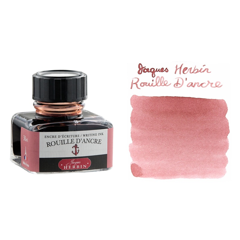 This 30ml glass bottle of Jacques Herbin Rouille d'Ancre pink fountain pen ink is elegantly labeled and has an integrated pen rest. Jacques Herbin ink is non-toxic and pH neutral, water based, flows smoothly, and uses all natural dyes.Rouille dancre (Rusty
