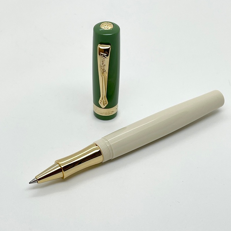 The Kaweco Student Rollerball - 60's Swing Green is made of high-quality precious resin in a beautifulgreen and ivory color combination with gold-plated accents. This rollerball enables particularly easy writing with an exceptionally soft writing feel. Ref