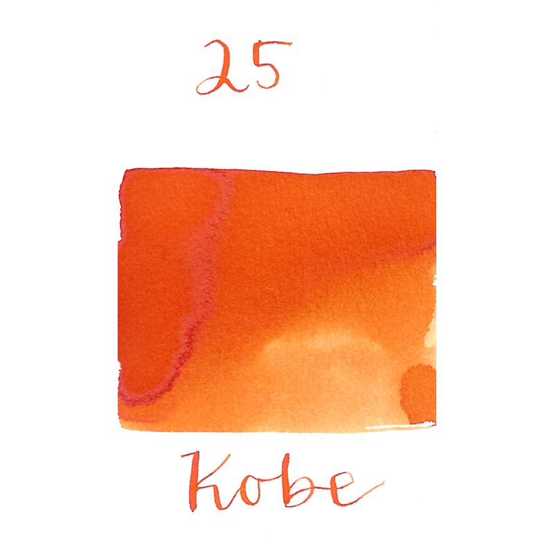 Kobe 25 Tarumi Apricot is a bright persimmon orange ink with low shading. It dries in 20 seconds in a medium nib on Rhodia and has a wet flow. Kobe ink is made in Japan.