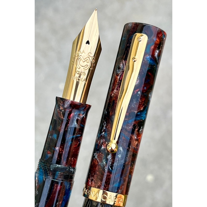 Established in 2014, Magna Carta is a leading manufacturer of fountain pens from India. With a specialization in in-house production of fountain pens, nibs, and resins, Magna Carta prides itself on maintaining high standards for pen collectors and enthusiasts. In 2023, two new flagship models were unveiled: the MAG1000 and the MAG600. The MAG1000 boasts a #10 nib, exclusive to the model, making it Magna Carta’s largest pen to date, surpassing even the Namiki Emperor in size. The MAG600 features a #6 14K True Flex Nib and an ebonite feed, reminiscent of vintage flexible gold nib pens.