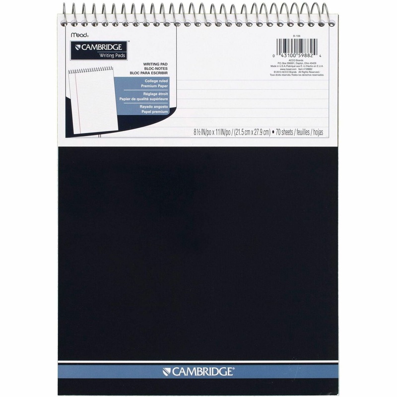 Wirebound pad contains 70 sheets of heavyweight, 20 lb. paper. Each sheet is microperforated for clean tear-out and college-ruled with 9/32″ line spacings and a 1-1/4″ left margin. Design includes a stiff, 80 point backing for portable writing convenience. Pad has spiral lock at the top for easy note-taking and a protective cover.