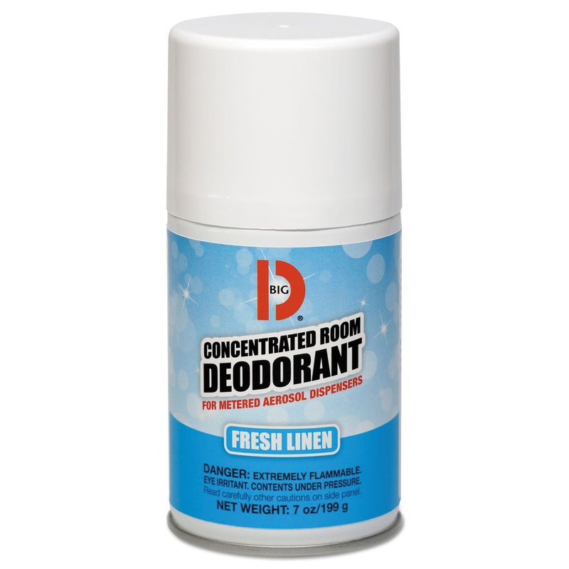 Eliminate odors instead of just masking them, with a concentrated deodorant and odor neutralizer. A uniform actuator valve allows this can to be used in most metered aerosol dispensers. A long lasting fresh scent ensures a pleasant environment. CONCENTRATED ROOM DEODORANT for Metered Aerosol Dispensers is a true BIG D odor counteractant specially formulated for industrial and institutional needs. The formula contains no 1-1-1 Trichloroethane or fluorocarbons. BIG D offers an assortment of pleasant fragrances containing our special deodorizers that neutralize odors rather than mask them. The uniform actuator valve enables the aerosol canister to be used in BIG D METERED AEROSOL DISPENSERS. Each 7 oz. can contains approximately 3,400 sprays and effectively deodorizes a 6,000 cu. ft. area.