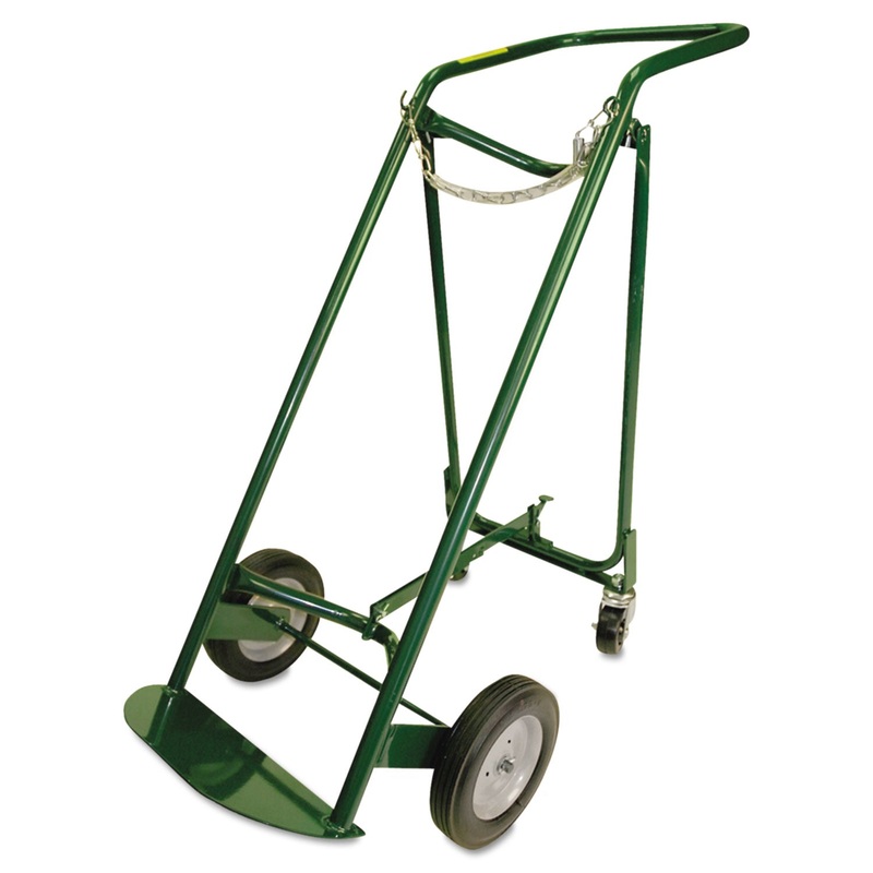 Designed for medical-gas cylinders. Four-wheel, set-tilt design. Plastic-sheathed, spring-loaded metal bracket chain.