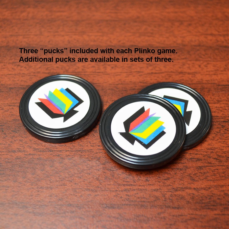 Each Plinko game comes with three “Pucks”. However, depending on how creative you are, you might need a few more. Sold in sets of three, Mini Plinko “Pucks” are now available in Orange only.