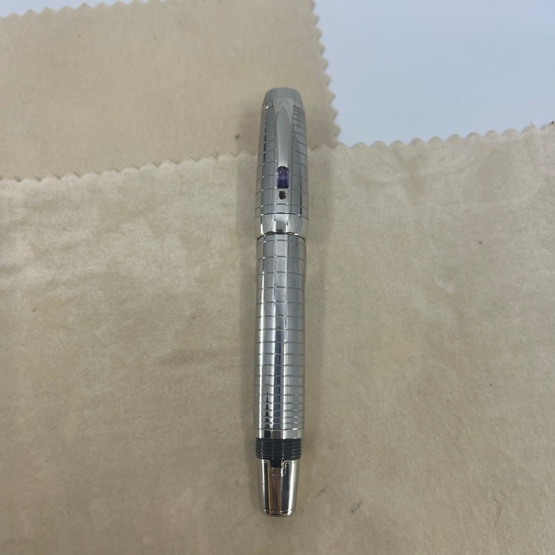 Montblanc Boheme Steel Noir Fountain Pen – Stainless Steel Radial Body – PlatinumPlated Trim – Retractable Nib – Synthetic Amethyst Jewel at the Clip – CARTRIDGEFILL Only – Circa 2004 – No Original Box– One of the More Elegant of the Boheme Designs – MINT – Medium 18kt Gold Nib – $550