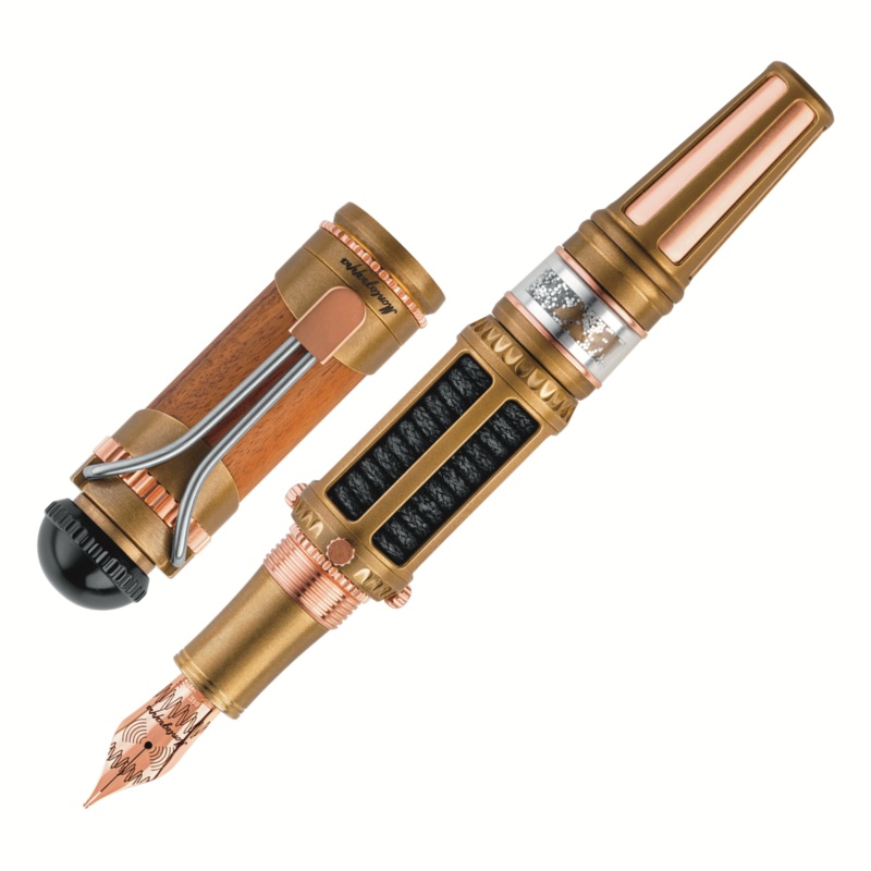 Fountain pens use a concealed Power-Push mechanism, and carry an 8mm, 18K rose-gold nib (EF, F, M, B, Stub 1.1) with an ebonite feed. On the nib, custom engraving reproduces wave forms on a copper-colored ground, and pens are supplied with a custom-engraved bottle of black ink.