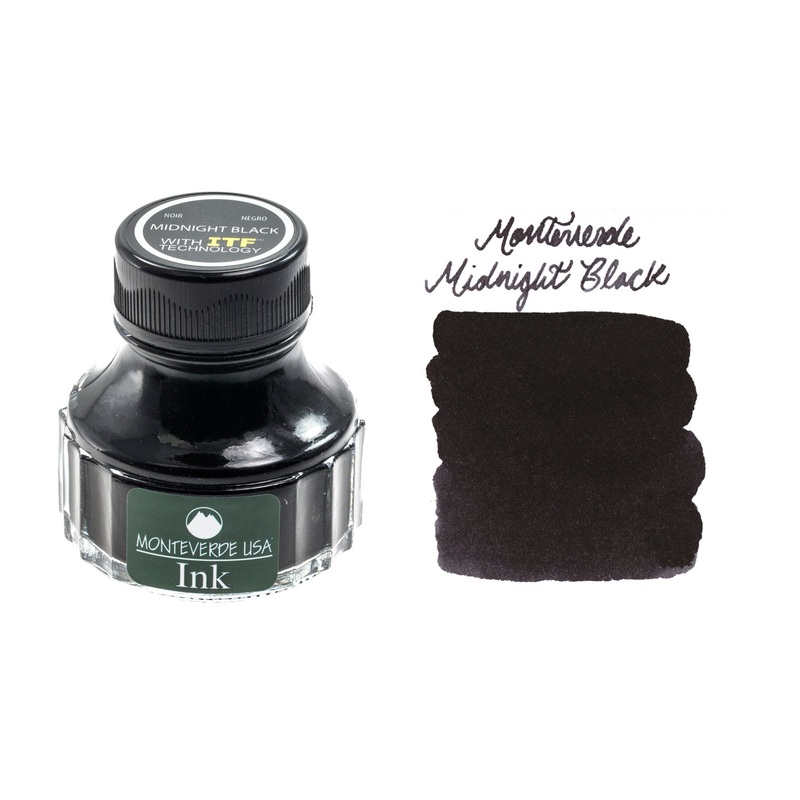 90ml bottle of Monteverde Midnight Black fountain pen ink. Monteverde ink is lubricated to help prevent it from drying out in your pen.