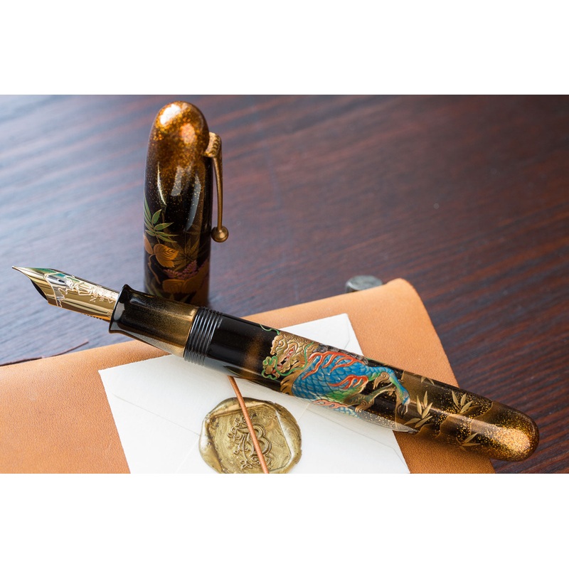 This Namiki Emperor maki-e fountain pen was created in 2012 by maki-e artisan Masaru in Japan. It features the Togidashi-Taka Maki-e technique (burnished-raised maki-e), depicting a mythical created called a Kylin.