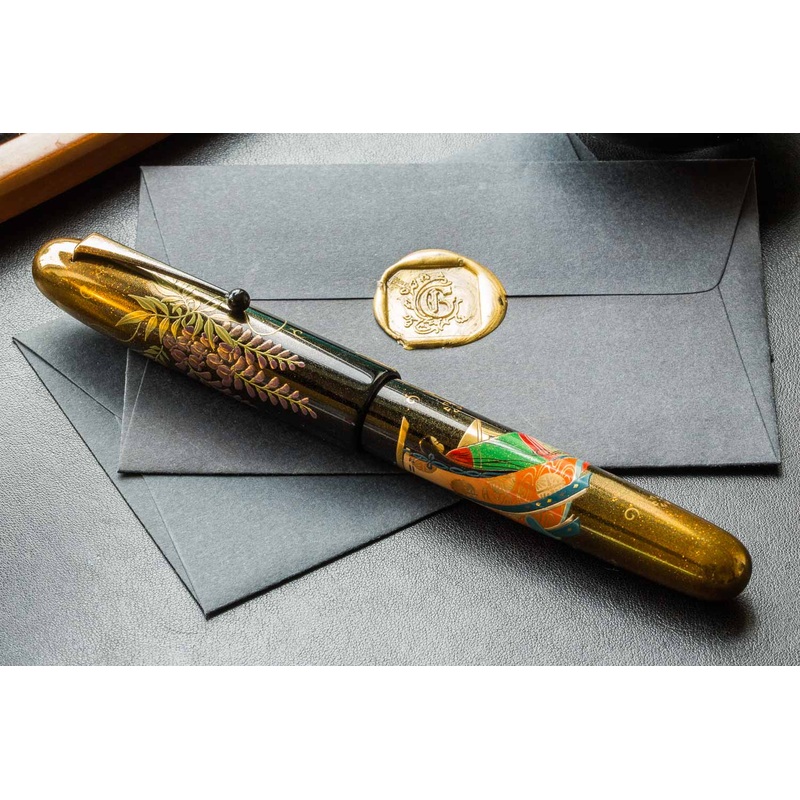 This Namiki Emperor maki-e fountain pen was created by maki-e artisan Shinsai in Japan. It features the Togidashi-Taka Maki-e technique (burnished-raised maki-e), depicting the Japanese author Murasaki Shikibu. This fountain pen has a 18k gold nib in the m