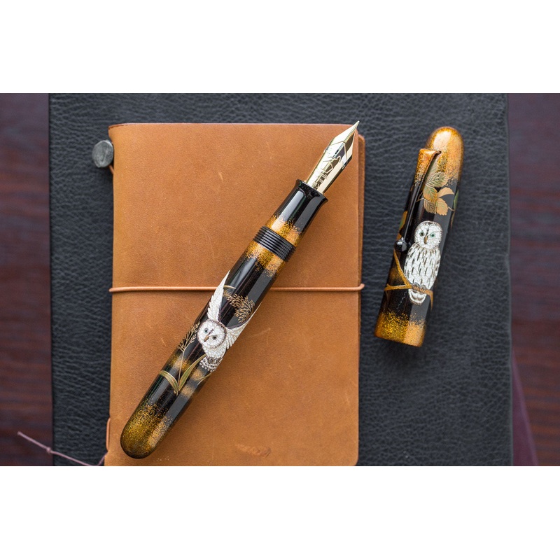 In the Japanese culture, the owl, or “Fukuro”, means luck and protection from hardship or suffering. Using ebonite as its base, the Rankaku Maki-e is used to design both the owls on the pen, and the Raden technique is used to embed the eyes of the owls making them sparkle. A layer of clear urushi lacquer is then used to protect the surface of the pen giving it a glossy polish. The Rankaku artwork is simply outstanding with the incredible attention to detail.