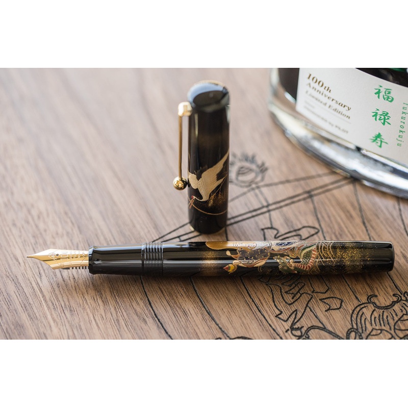 This Namiki Seven Gods Yukari fountain pen was produced by Maki-e artisan Masahiro Yamada for Pilot’s 100th anniversary. It features the Togidashi-Taka Maki-e technique, as well as inlaid gold dust. It comes individually packaged in a wooden box with a 50ml bottle of matching limited edition green Iroshizuku ink and a leather pen wrap. This exquisitely lacquered brass fountain pen has a medium 18k gold nib in size #10, is complemented by gold trim, and fills via cartridge/converter (a Con-70 is included). Only 150 limited pens have been produced of each design worldwide.
