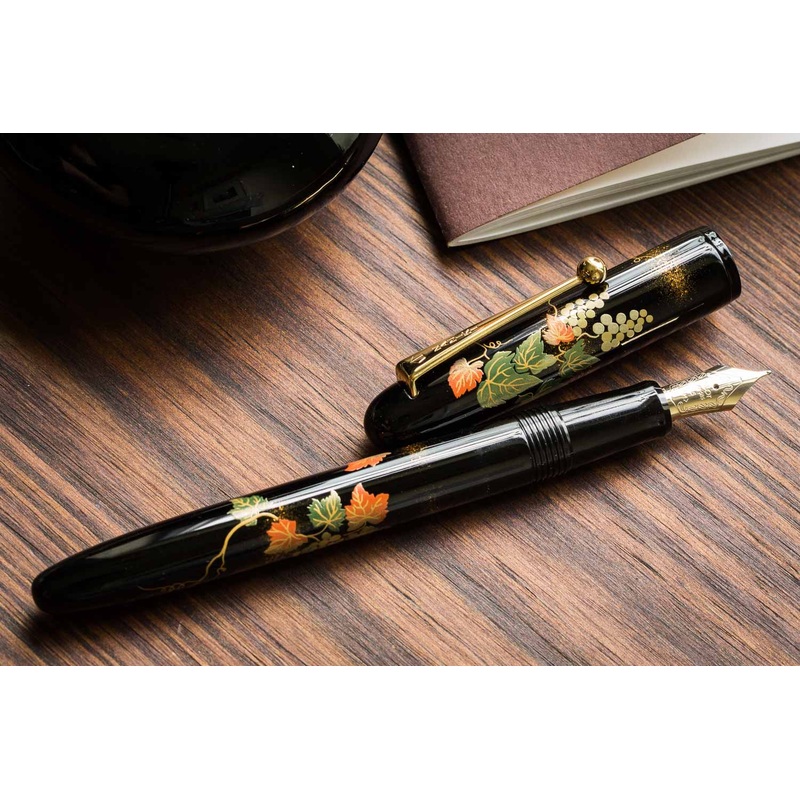 This Namiki maki-e fountain pen was created by a collaboration of maki-e artists (Kokkokai) in Japan. It features the Togidashi-Hira Maki-e technique (burnished-flat maki-e), depicting a grapevine. The pen has an 18k gold nib (#10), fills via cartridge/con