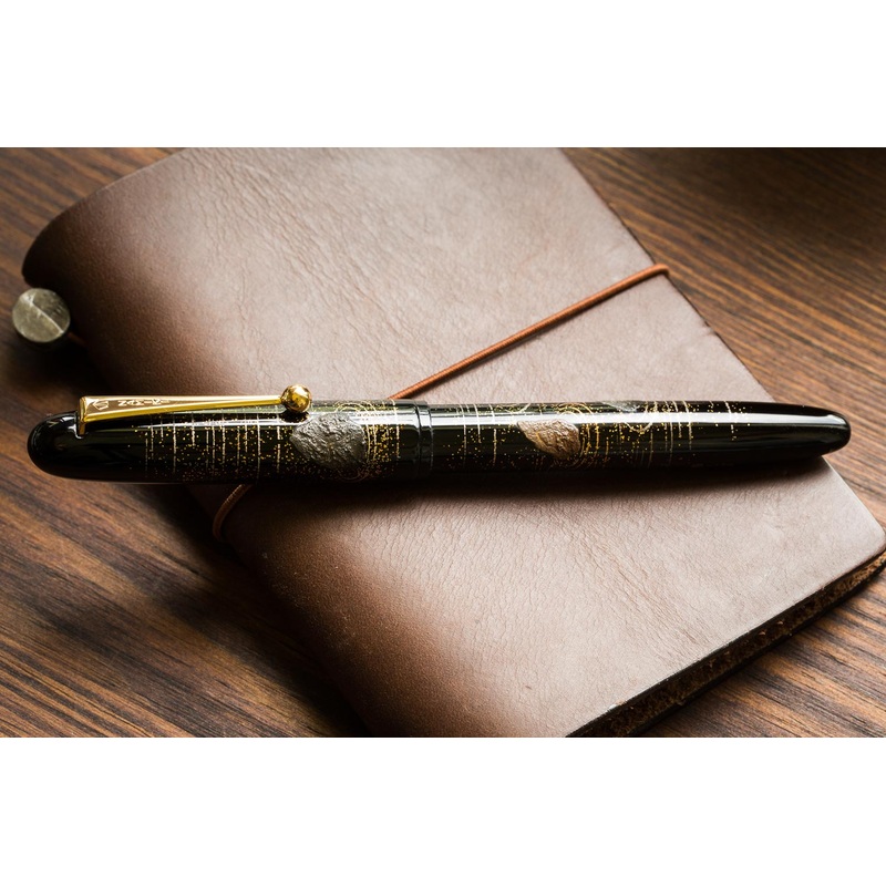This Namiki Yukari Rock Garden maki-e fountain pen was released in November 2013 by a collaboration of maki-e artists (Kokkokai) in Japan. It features the Togidashi-Hira Maki-e technique (burnished-flat maki-e), depicting a traditional Japanese rock garden. The pen has an 18k gold nib in size #10, fills via cartridge/converter (a CON-70 is included), and comes packaged in a wooden box with a bottle of ink.