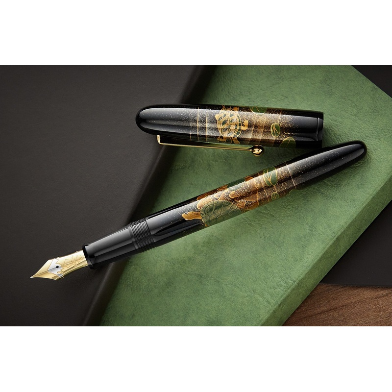 This Namiki maki-e fountain pen was created by maki-e artisan Seiki in Japan. It features the Togidashi-Taka Maki-e technique (burnished-raised maki-e), depicting swimming turtles. The pen has an 18k gold nib (#10), fills via cartridge/converter (a CON-70 is included), and comes packaged in a wooden box with a bottle of ink.