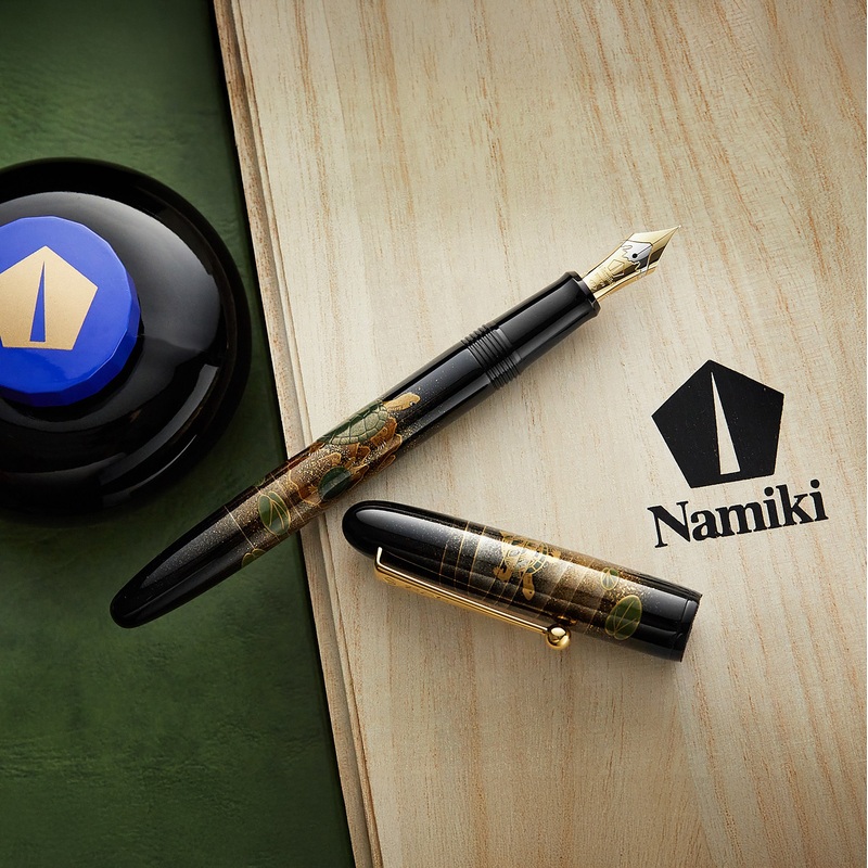 This Namiki maki-e fountain pen was created by maki-e artisan Seiki in Japan. It features the Togidashi-Taka Maki-e technique (burnished-raised maki-e), depicting swimming turtles. The pen has an 18k gold nib (#10), fills via cartridge/converter (a CON-70 is included), and comes packaged in a wooden box with a bottle of ink.
