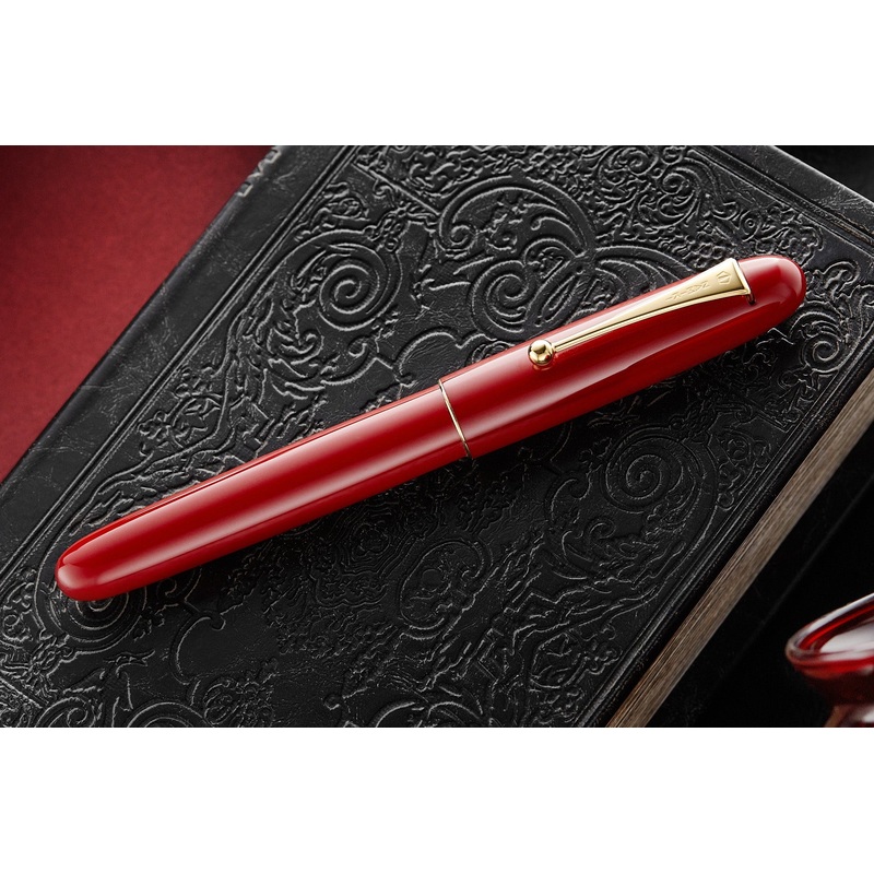 This Namiki Yukari Royale Urushi maki-e fountain pen was created by maki-e artisans (kokkokai) in Japan. It features the Roiro Urushi technique in solid vermillion red. The pen has an 18k gold nib in size #20, fills via cartridge/converter (a CON-70 is included), and comes packaged in a wooden box with a bottle of ink.
