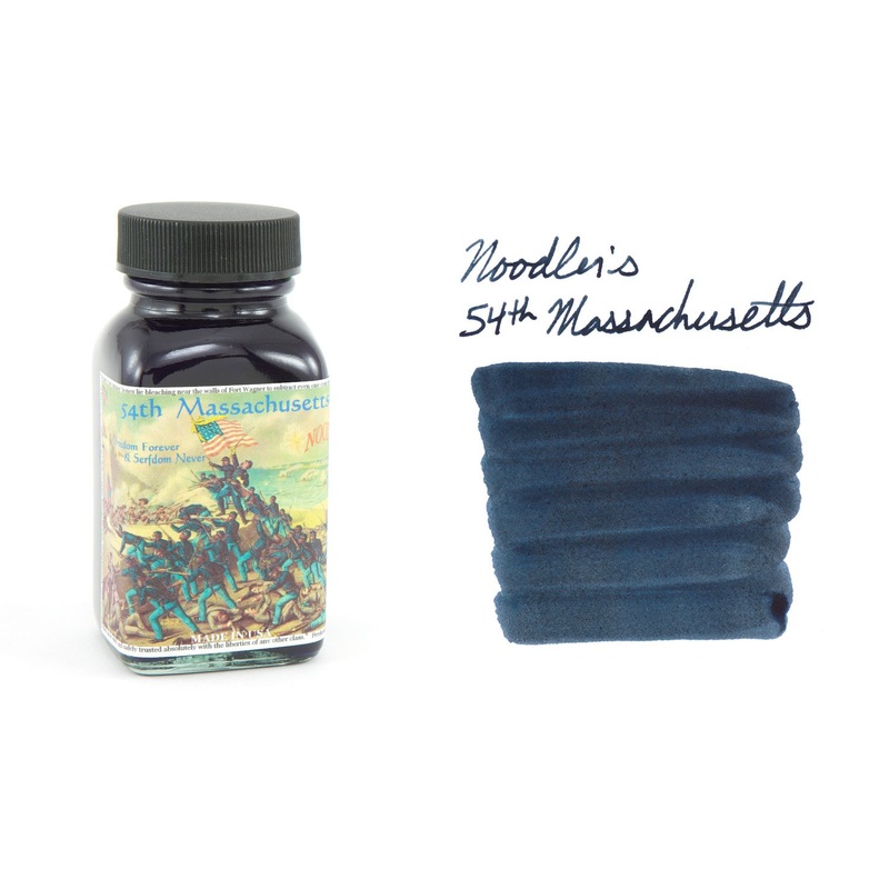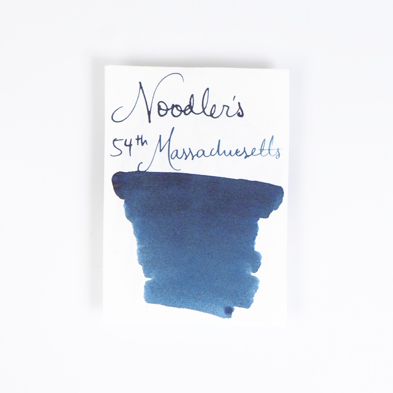 3oz (90ml) glass bottle of Noodler's 54th Massachusetts fountain pen ink. 54th Massachusetts is a bulletproof, legal blue-black. Noodler's inks are handcrafted, so there may be slight color variations from batch to batch.