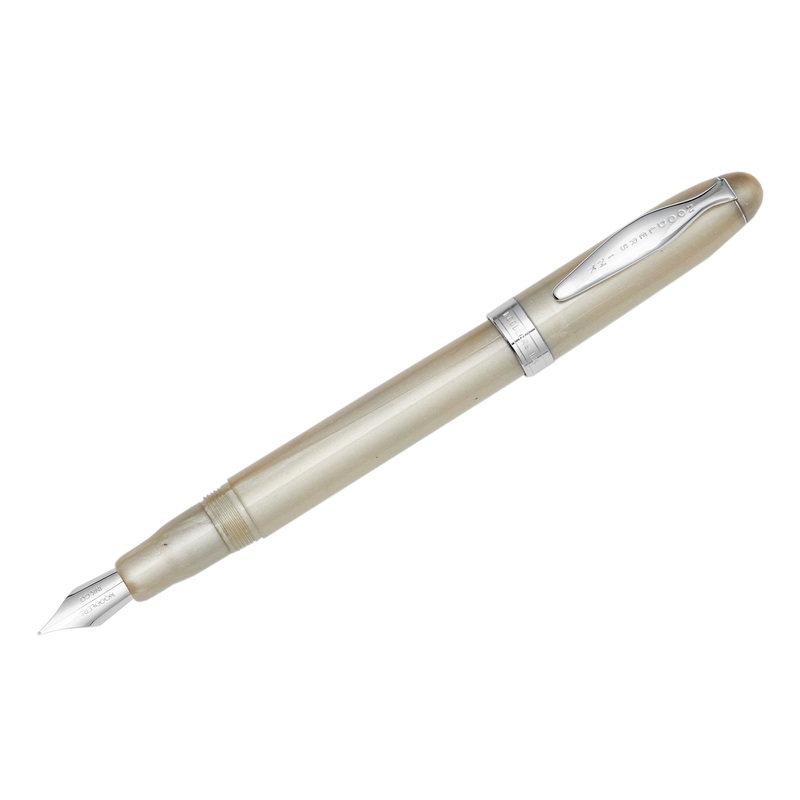 The Noodler's Ahab flex pen features a steel flexible #6 nib and a slide piston mechanism. If you'd like, you can even remove the piston mechanism and use the pen as an eyedropper for a massive 6ml ink capacity. This pearlescent white Ahab is made of a cel
