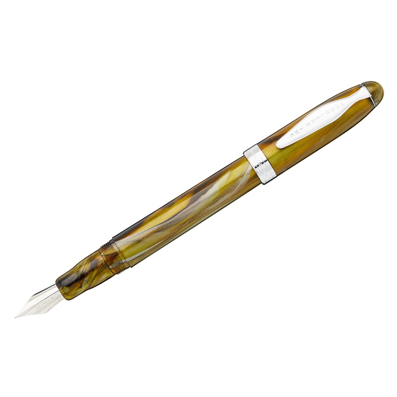 The Noodler's Ahab flex pen features a steel flexible #6 nib and a slide piston mechanism. If you'd like, you can even remove the piston mechanism and use the pen as an eyedropper for a massive 6ml ink capacity. This yellow-orange Ahab is made of a cellulo