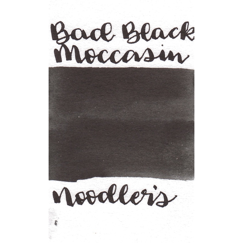 Noodlers Bad Black Moccasin from the Bulletproof collection is a deep black ink. It dries in 40 seconds in a medium nib on Rhodia and has a slightly wet flow. Noodlers ink is made in the United States.BulletproofArchival - fade resistantForgery ResistantWa