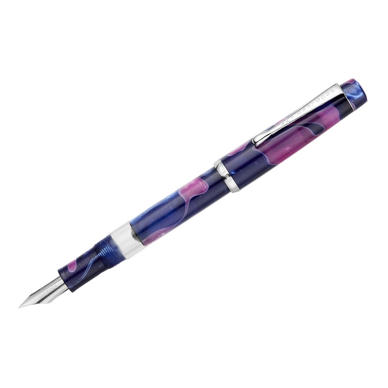 The Noodler's Konrad flex pen is smaller than the Ahab, but larger than the Nib Creaper. This purple and blue acrylic resin fountain pen features a steel flexible nib and a twist piston mechanism with a blind cap. The Konrad Acrylic is made of acrylic acet