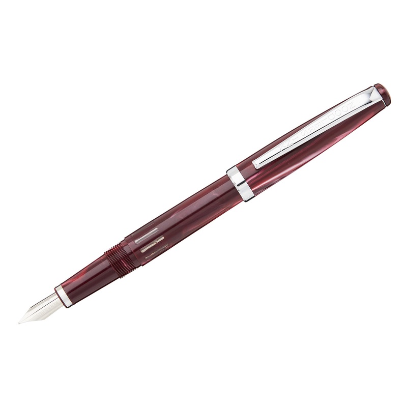 This burgundy and white Noodler’s Nib Creaper flex fountain pen features a small, slender body with a steel flexible #2 nib and a twist piston mechanism. A small ink window shows how much ink is left in your pen. These pens are made from a celluloid derivative. The vegetal resin body of this pen may show particles or striations within the material. This is most noticeable in demonstrators and bright colors.
