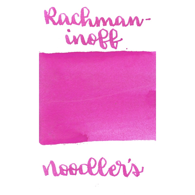 Noodlers Rachmaninoff from the eternal collection is a bright pink ink. This ink is bulletproof, forgery and water resistant, and fluorescent. It dries in 10 seconds in a medium nib on Rhodia and has an average flow. Noodlers ink is made in the United Stat