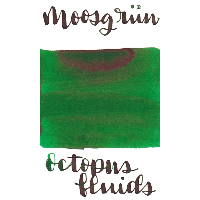 Octopus Moosgrun (Moss Green) from the Standard collection is a dark green ink with low shading and low red sheen. It dries in 5 seconds in a medium nib on Rhodia and has an average flow. Octopus Fluids ink is made in Germany.BrandOctopus FluidsInk NameMoo