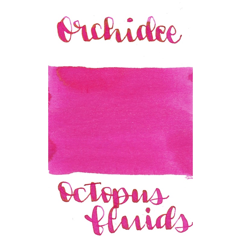 Octopus Orchidee from the Standard collection is a bright hot pink ink with low shading. It dries in 30 seconds in a medium nib on Rhodia and has an average flow. Octopus Fluids ink is made in Germany.BrandOctopus FluidsInk NameOrchideeCountry of OriginGer