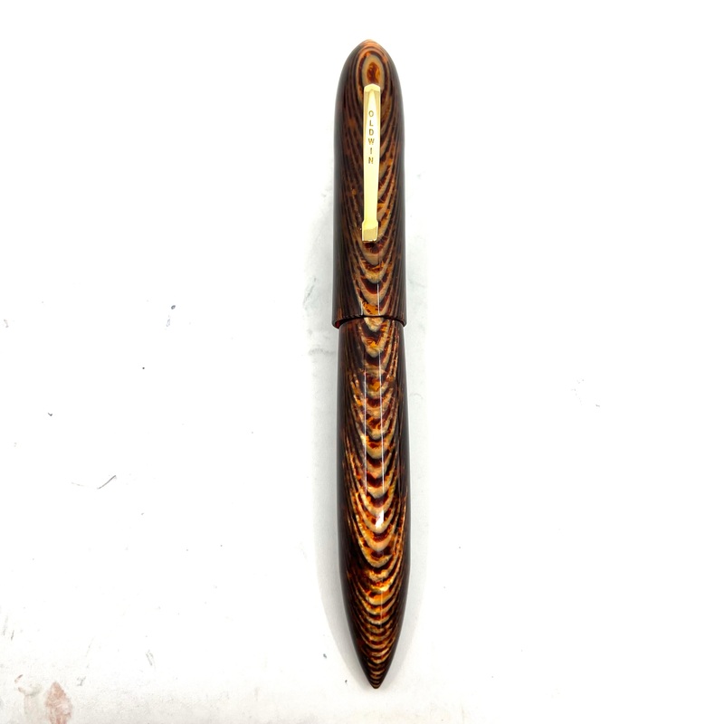 Oldwin (Paris) Torpedo Bronze Arco Spina (Fish Bone) PatternCelluloid LE Fountain Pen – Captured Converter filling system – 2022 –LE #28/44 – Retail $2,495 – No Original Box – Oversized Flexible Medium 14kt Gold Nib – MINT – $1,500