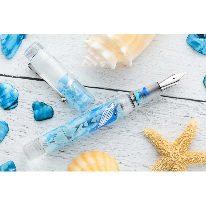 The Opus 88 Demonstrator fountain pen in Blue Whale is a truly unique writing instrument. This large non-postable pen is an eyedropper-filled pen with a piston operated shut-off valve. It features a beautiful and fun blue whale design throughout the acryli