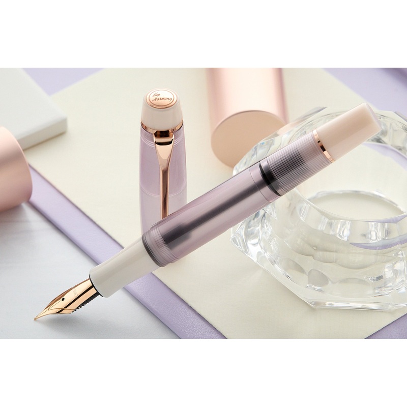 The Opus 88 Harmony fountain pen is a truly unique writing instrument. The Harmony is an eyedropper-filled pen with a piston operated shut-off valve. It has a rose gold-plated clip and a rose gold-plated stainless steel #6 JoWo nib and includes a glass eyedropper to fill the pen with your favorite ink. Complemented with an ivory colored finial and end cap, and a translucent light pink/purple cap and barrel, Mocha Mousse is a limited edition design for 2025.