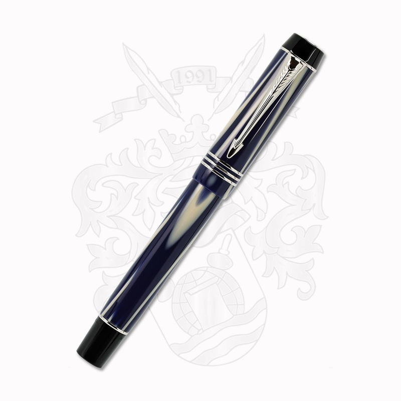 Parker Duofold True Blue Limited Edition Fountain Pen. This magnificent writing instrument was released in 2007 as a present day rendering of the exquisite Parker True Blue of the 1920's. This extremely rare masterpiece pays homage to George S. Parker.In 1