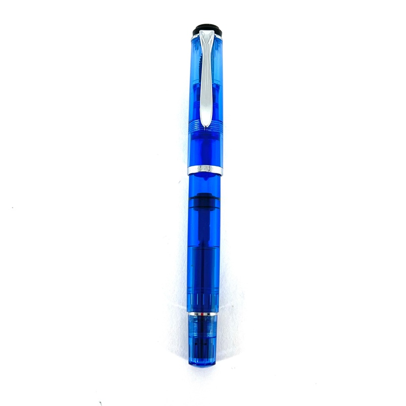 Pelikan M205 Blue Transparent Fountain Pen - Chrome Plated Trim - Piston Fill - 2004 - Italic Stainless Steel Nib - Original Box/Paperwork - Mint - $145