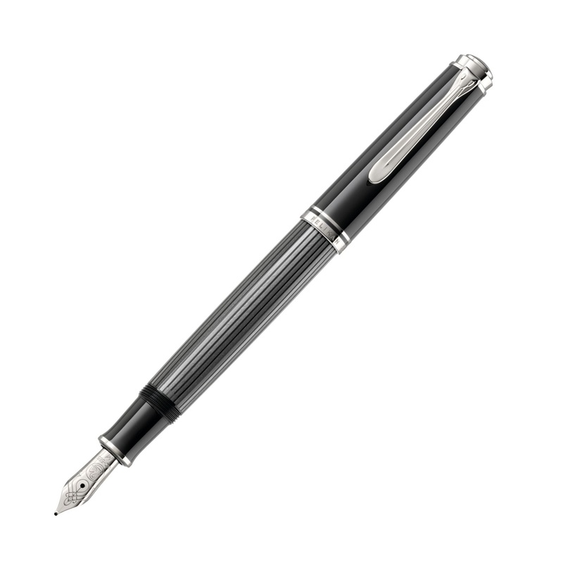 The production of the Souvern sleeve is subject to an elaborate process. The typical, striped material is made out of cotton based on a formula developed specially for Pelikan. It takes month until the block providing the stripes is finished, whereupon the tailor-made plating is curved and cut into a contour using a natural diamond. The characteristic double rings are then integrated into the cap and barrel with the utmost precision. The writing instrument is then polished until it reaches a brillant luster. The fountain pen M605 with piston filling mechanism provides a 14-carat completely rhodium-plated gold nib and is available with the nib sizes EF, F, M or B. The F nib creates a fine typeface and is suitable for handwritings with smaller swings. “