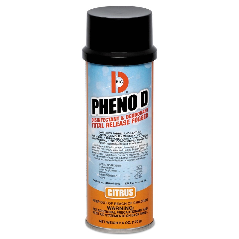 BIG D PHENO D is an EPA registered hospital-use and broad-spectrum disinfectant and antimicrobial agent. It kills HIV-1 (AIDS Virus) and Herpes Simplex Types 1 & 2 Viruses on precleaned environmental surfaces and objects previously soiled with blood or body fluids. Use on toilets, urinals, bathtubs, shower stalls, seats, benches, lockers, partitions, counters, fixtures, knobs, handles, railings, telephones, furniture, equipment and other surfaces which could harbor hazardous microorganisms. This aerosol fogger is intended for use on precleaned, hard, nonporous, nonfood-contact surfaces in industrial, institutional, commercial, medical/residential facilities, equipment and vehicles including hospitals, ambulances, nursing homes, medical/dental offices and clinics, veterinary offices and animal areas, schools, laboratories, hotels/motels, restaurants/cafeterias, food storage, processing, packaging, handling and serving establishments and equipment, offices, stores, factories/manufacturing plants, apartment buildings and homes.