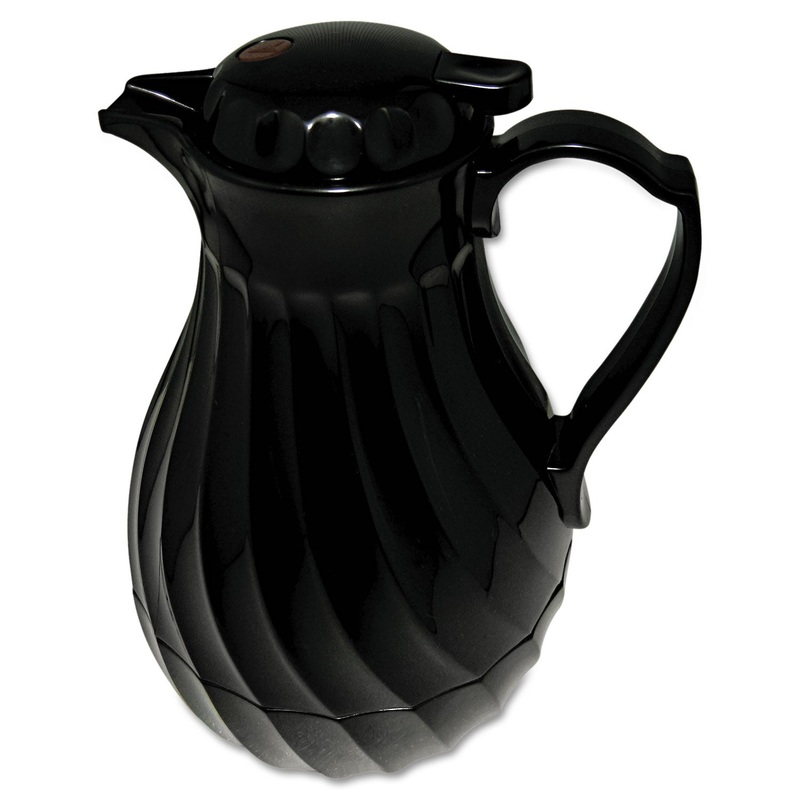 Polyurethane insulation keeps beverages hot or cold. Shatterproof liner is odorless and stainproof. Pours without removing stopper. Dishwasher-safe.