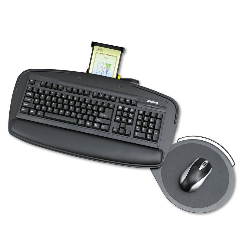 Ultra-thin, contoured keyboard platform features Comfort Zone customized positioning for superior ergonomic control. 6" height range adjustment with leverless tilt and release mechanism. Easily accessible knob adjusts tilt +10/-15 without having to reach u